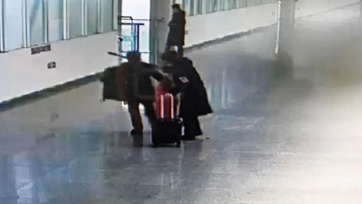 看到老人拿着2个行李箱、1个麻袋,且独自出行,工作人员一边指引老人去往二楼候车室,一边通过对讲机提示同事做好重点服务。